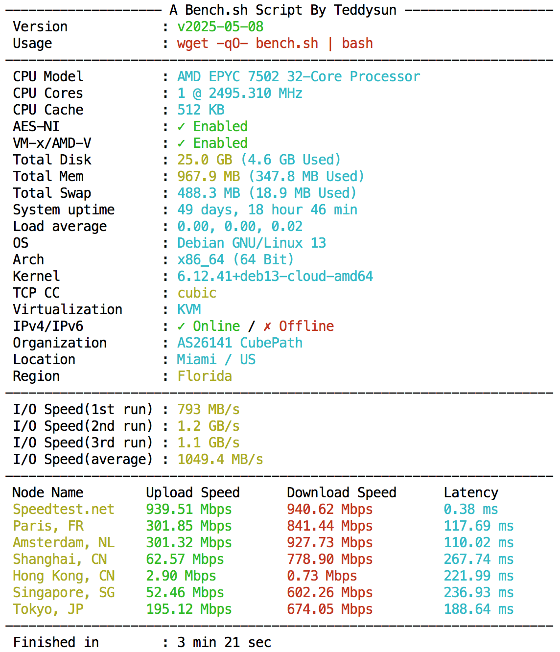 # ## ## ## ## ## ## ## ## ## ## ## ## ## ## ## ## ## # # Yet-Another-Bench-Script # # v2024-12-17 # # https://github.com/masonr/yet-another-bench-script # # ## ## ## ## ## ## ## ## ## ## ## ## ## ## ## ## ## # Thu Dec 15 09:45:10 UTC 2024 Basic System Information: --------------------------------- Uptime : 33 days, 10 hours, 15 minutes Processor : AMD EPYC-Milan Processor CPU cores : 32 @ 2399.998 MHz AES-NI : ✔ Enabled VM-x/AMD-V : ✔ Enabled RAM : 61.3 GiB Swap : 0.0 KiB Disk : 393.7 GiB Distro : Debian GNU/Linux 12 (bookworm) Kernel : 6.8.12-4-pve VM Type : NONE IPv4/IPv6 : ✔ Online / ✔ Online IPv6 Network Information: --------------------------------- ISP : OVH SAS ASN : AS16276 OVH SAS Host : OVH Location : Gravelines, Hauts-de-France (HDF) Country : France fio Disk Speed Tests (Mixed R/W 50/50) (Partition /dev/sda1): --------------------------------- Block Size | 4k (IOPS) | 64k (IOPS) ------ | --- ---- | ---- ---- Read | 323.10 MB/s (80.7k) | 2.05 GB/s (32.1k) Write | 323.96 MB/s (80.9k) | 2.06 GB/s (32.3k) Total | 647.06 MB/s (161.7k) | 4.12 GB/s (64.5k) | | Block Size | 512k (IOPS) | 1m (IOPS) ------ | --- ---- | ---- ---- Read | 2.33 GB/s (4.5k) | 2.39 GB/s (2.3k) Write | 2.45 GB/s (4.7k) | 2.55 GB/s (2.4k) Total | 4.78 GB/s (9.3k) | 4.94 GB/s (4.8k) iperf3 Network Speed Tests (IPv4): --------------------------------- Provider | Location (Link) | Send Speed | Recv Speed | Ping ----- | ----- | ---- | ---- | ---- Clouvider | London, UK (10G) | 3.91 Gbits/sec | 3.92 Gbits/sec | 5.08 ms Eranium | Amsterdam, NL (100G) | 3.90 Gbits/sec | 3.88 Gbits/sec | 11.1 ms Leaseweb | Singapore, SG (10G) | 1.10 Gbits/sec | 834 Mbits/sec | -- Clouvider | Los Angeles, CA, US (10G) | 1.23 Gbits/sec | 1.28 Gbits/sec | 138 ms Leaseweb | NYC, NY, US (10G) | 1.63 Gbits/sec | 2.47 Gbits/sec | -- Edgoo | Sao Paulo, BR (1G) | 802 Mbits/sec | 916 Mbits/sec | 185 ms iperf3 Network Speed Tests (IPv6): --------------------------------- Provider | Location (Link) | Send Speed | Recv Speed | Ping ----- | ----- | ---- | ---- | ---- Clouvider | London, UK (10G) | 3.86 Gbits/sec | 3.86 Gbits/sec | 4.24 ms Eranium | Amsterdam, NL (100G) | 3.84 Gbits/sec | 3.82 Gbits/sec | 10.1 ms Leaseweb | Singapore, SG (10G) | 404 Mbits/sec | 991 Mbits/sec | 161 ms Clouvider | Los Angeles, CA, US (10G) | 960 Mbits/sec | 1.28 Gbits/sec | 137 ms Leaseweb | NYC, NY, US (10G) | 2.18 Gbits/sec | 2.40 Gbits/sec | 76.2 ms Edgoo | Sao Paulo, BR (1G) | 734 Mbits/sec | 913 Mbits/sec | 184 ms Geekbench 6 Benchmark Test: --------------------------------- Test | Value | Single Core | 2007 Multi Core | 16712 Full Test | https://browser.geekbench.com/v6/cpu/xxxxxx YABS completed in 10 min 57 sec