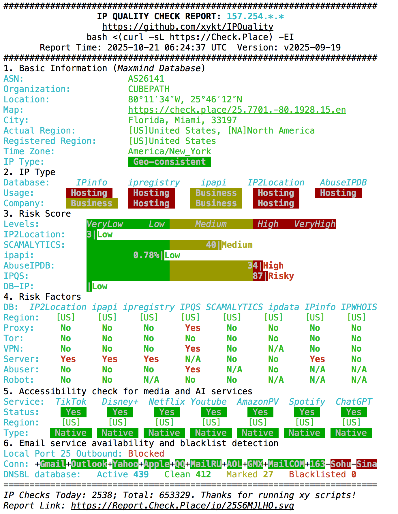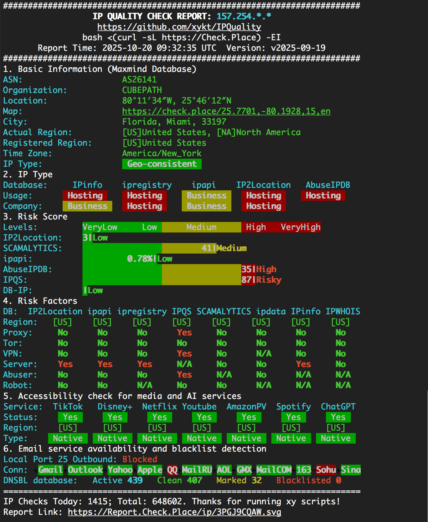 check IP address geographical location information, blacklisting, risk score and factors (using IPQuality for example)IP Quality Check Script output ▾